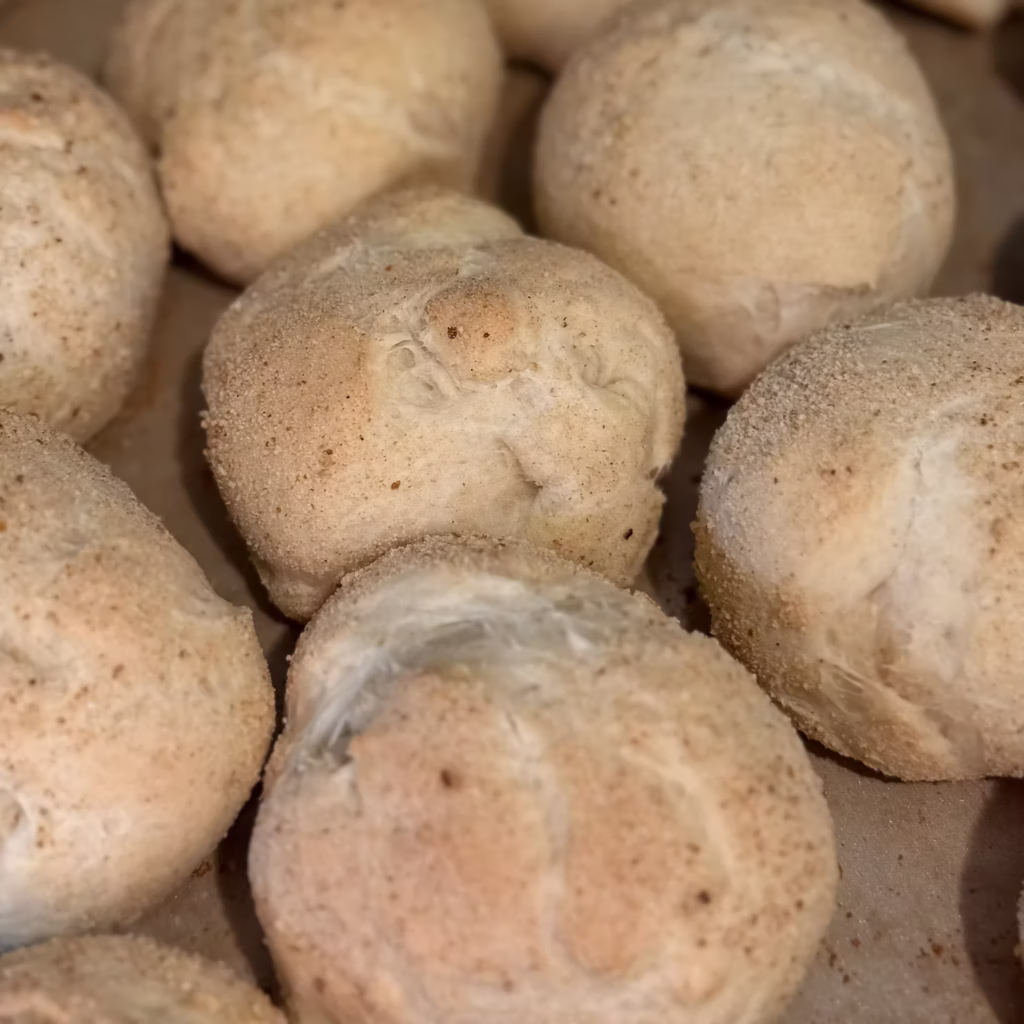 - After rising, knead the dough again. Shape into small balls, toss in fine plain bread crumbs, and place on a greased baking pan with about 1 inch of space between rolls. Then let rise for another 45 minutes-1 hour.